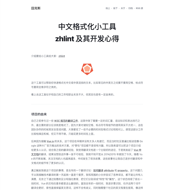 <meta name="twitter:description" content="介绍要给小工具给大家:**zhlint** zhlint logo 这个工具可以帮助你快速格式化中文或中英混排的文本。比如常见的中英文之间要不要用空格、标点符号要用全角字符之类的。 看上去这工具似乎和自己的工作和职业关系不大,但其实也是有一定由来的。 项目的由来 自己之前参与过一些 W3C 规范的翻译工作,这其中除了需要一定的词汇量、语法知识和表达技巧之外,最主要的部分应该就是格式了。因为大...">