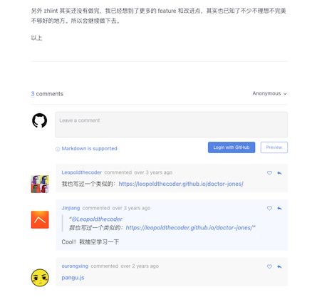 <meta name="og:description" content="介绍要给小工具给大家:**zhlint** zhlint logo 这个工具可以帮助你快速格式化中文或中英混排的文本。比如常见的中英文之间要不要用空格、标点符号要用全角字符之类的。 看上去这工具似乎和自己的工作和职业关系不大,但其实也是有一定由来的。 项目的由来 自己之前参与过一些 W3C 规范的翻译工作,这其中除了需要一定的词汇量、语法知识和表达技巧之外,最主要的部分应该就是格式了。因为大...">