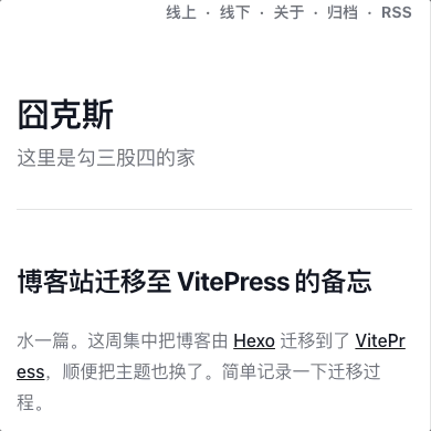 水一篇。这周集中把博客由 Hexo 迁移到了 VitePress,顺便把主题也换了。简单记录一下迁移过程。